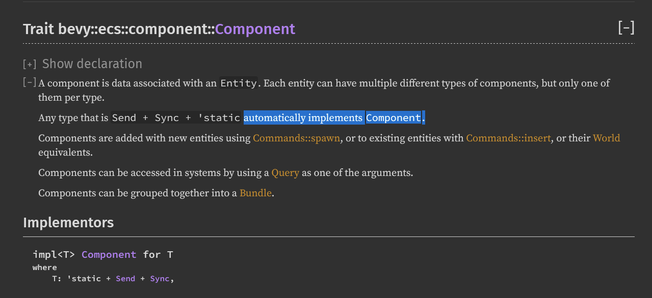 ...이게 Component (bevy 프레임워크의 개념) 를 구분하는 데에는 아쉽게도 도움이 되지 않더군요. 이 경우, blanket implementation (일종의 자동 구현) 에 있었습니다. 'static + Send + Sync 에 모조리 구현해놔서 사실상 도움이 안 되던. 원래 그런 컨셉이기도 하구요.