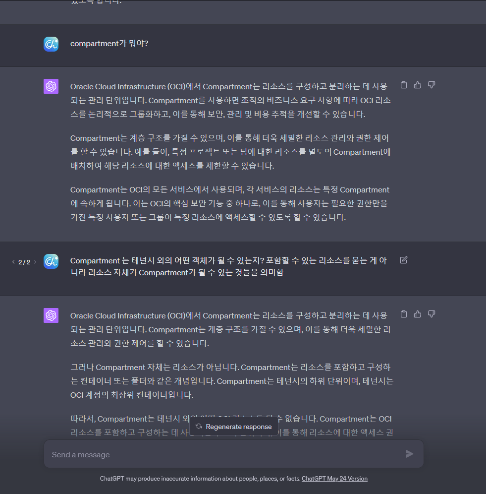 - Compartment (구획): 개념적인 리소스 분할의 단위입니다. 루트 테넌시가 루트 구획(Compartment) 입니다.